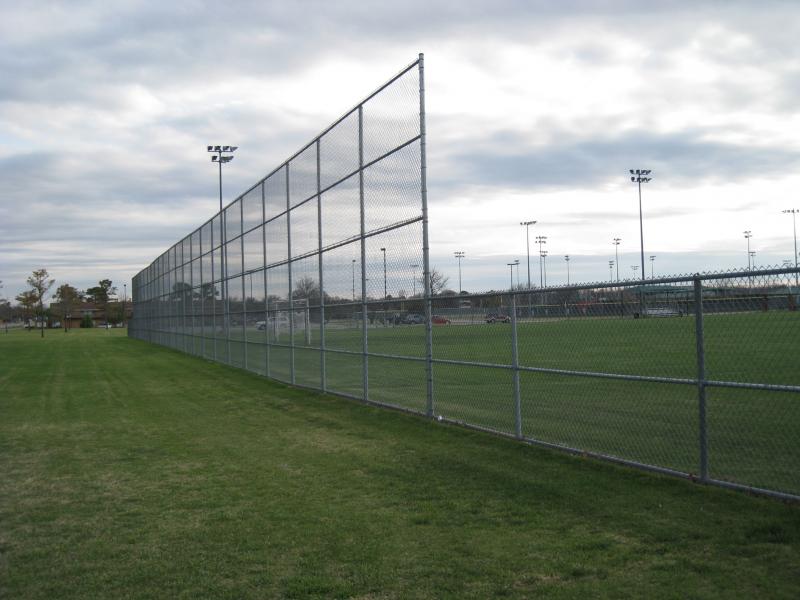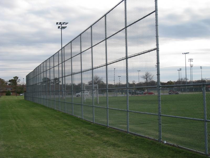 16' tall, 4 rail, 9 gauge, galvanized chain-link fence for soccer field perimeter.